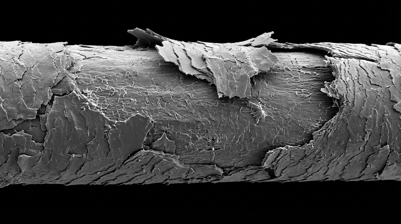 Daily styling, colouring, environmental stress and natural ageing all cause subtle structural changes within the hair. The cuticle begins to lift and the cortex becomes exposed. Moisture escapes, elasticity weakens and the fibre loses its natural smoothness.